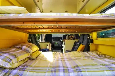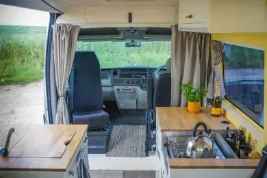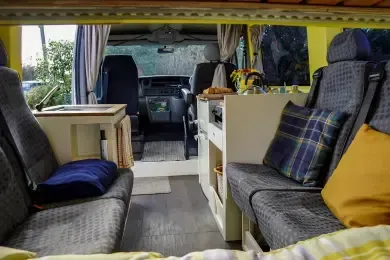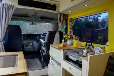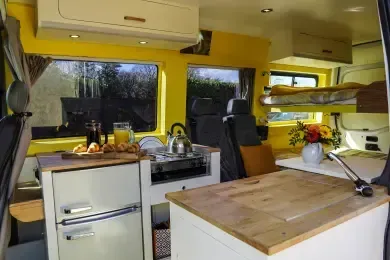 Originally a people carrier, Calvi has transformed into a light-filled wander wagon, thanks to its panoramic windows that serve up stunning views from sunrise to stargazing. With two cosy fixed small double beds, you’ll be drifting off in comfort – no faff, just flop and relax after a day of exploring.